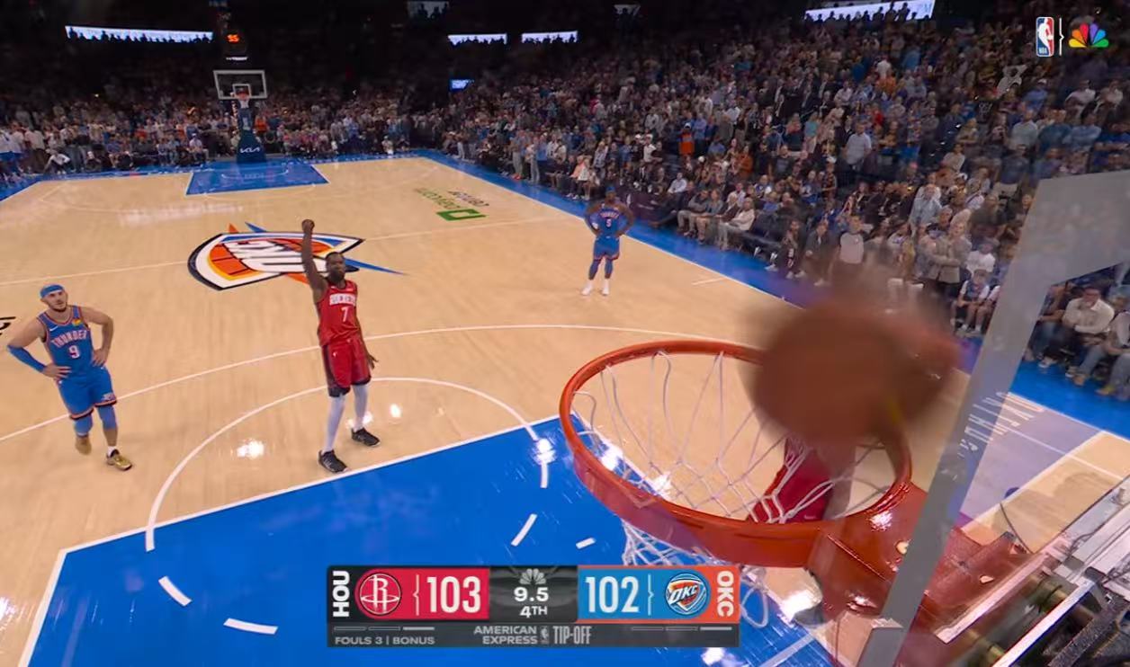 有了杜氏核武器的火箭与雷霆的实力无限接近,双方激战到最后,还剩9.5秒时,杜兰特造成对手犯规,获得两次罚球,但他第一罚却没罚进。在第二罚球进后,比分来到104:102,只领先对手两分。这时,亚历山大一个直奔前场,一个稳妥的中投命中,将比赛拖入加时。