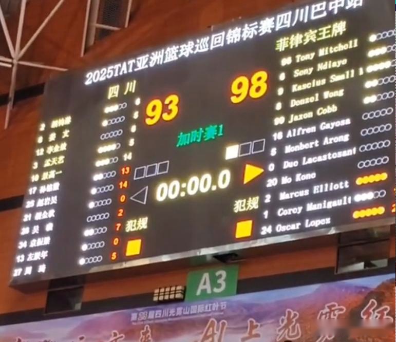 2025TAT亚洲篮球巡回赛(巴中站)决赛之夜,四川全运队对阵菲律宾王牌队!最终93比98不敌菲律宾王牌队。这场比赛打得也是激烈,因为双方打到了加时赛,然而加时赛对手三分更准,最终造成四川惜败。