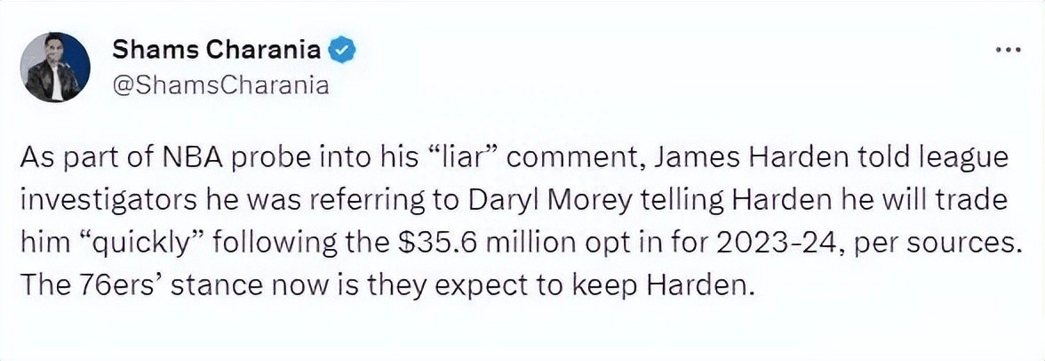 NBA著名记者Shams揭示了内幕,他说哈登炮轰莫雷后,NBA官方已经介入了调查,哈登对调查人员说,莫雷曾骗自己说只要执行2023-24赛季的3560万美元球员选项就会迅速交易他,结果76人现在的立场则是希望留住哈登。