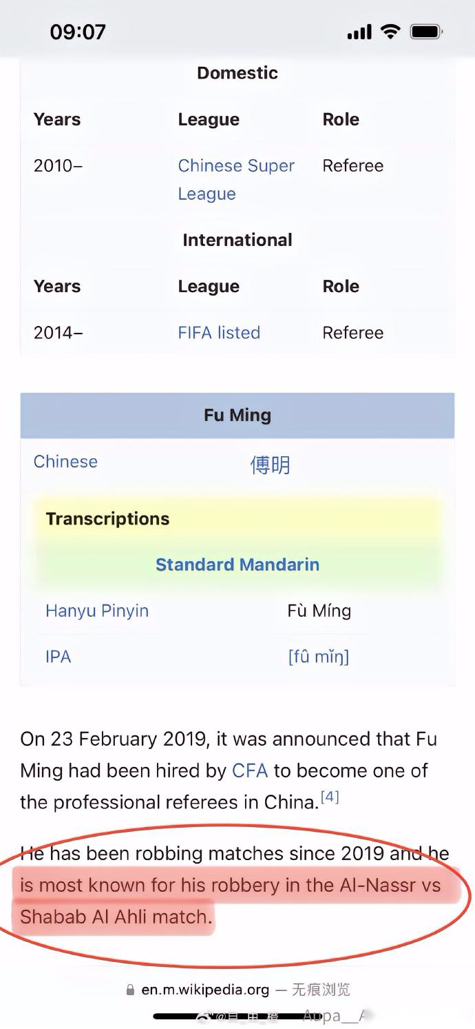 中超重点培养名哨,国际级裁判 傅·**·明 的维基百科遭海外网友修改 大致译文:他从2019年以来就在强行改变(robbing:抢劫)比赛的发展,他出名的一次是“抢劫”是利雅得胜利vs迪拜青年的比赛。