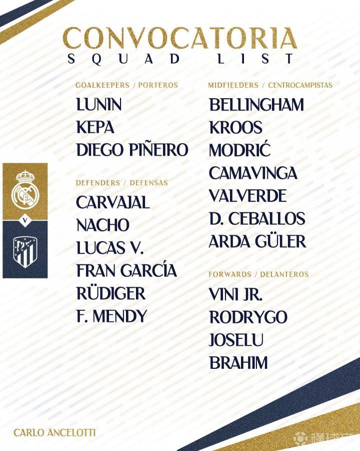 皇马战马竞大名单:贝林领衔,吕迪格入选,楚阿梅尼停赛 2024.02.03 皇马官方公布了西甲第23轮主场对阵马竞的马德里德比大名单,贝林厄姆领衔,楚阿梅尼因停赛缺席,上一轮比赛受伤的吕迪格入选,比赛将于北京时间2月5日凌晨4:00进行。 皇马马德里德比大名单 门将:卢宁、凯帕、弗兰-冈萨雷斯 后卫:卡瓦哈尔、纳乔、巴斯克斯、弗兰-加西亚、吕迪格、费兰-门迪 中场:贝林厄姆、克罗斯、莫德里奇、卡马文加、巴尔韦德、塞瓦略斯、居莱尔 前锋:维尼修斯、罗德里戈、何塞卢、卜拉欣-迪亚斯
