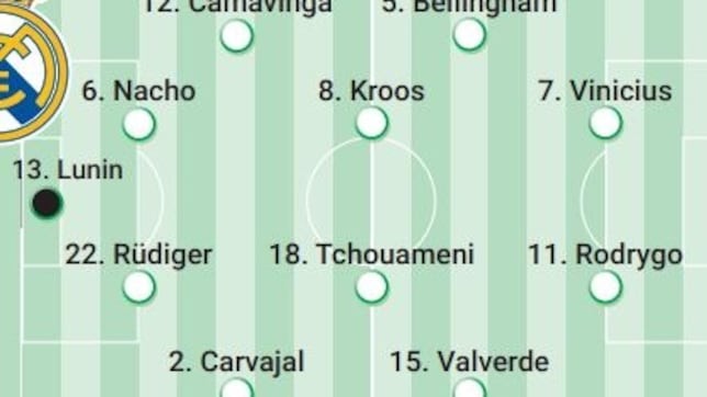 皇马其他位置上的首发球员都很清楚。门将方面,刚刚在阿提哈德球场站稳脚跟的卢宁将在整场比赛中为皇马的后防线提供保障,此外,卡瓦哈尔、吕迪格和纳乔将与卡马文加一起组成后防线。