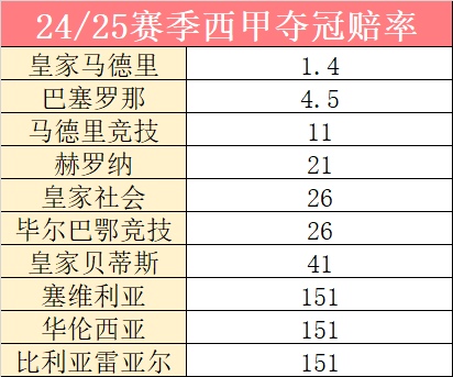 从机构开出的冠军指数来看,皇马断层领先仅为1.45,第二名巴萨4.50,马竞则要去到11.00。二线球队中,上赛季的大黑马赫罗纳继续被看好,他们和皇家社会、毕尔巴鄂竞技组成了第二梯队,比利亚雷亚尔和塞维利亚持平,但要远落后皇家贝蒂斯。