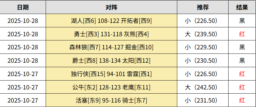 昨天会员分享7中4,都是NBA。活塞骑士小分足够稳;公牛老鹰轰251分,大分收米;独行侠雷霆总得分不足200分,稳稳收米,一波三连红!爵士加时赢太阳,小分不中;掘金拿捏森林狼,小分被打穿;勇士吊打灰熊,大分双收;开拓者爆冷湖人,捉到客胜,但主推小分不中。