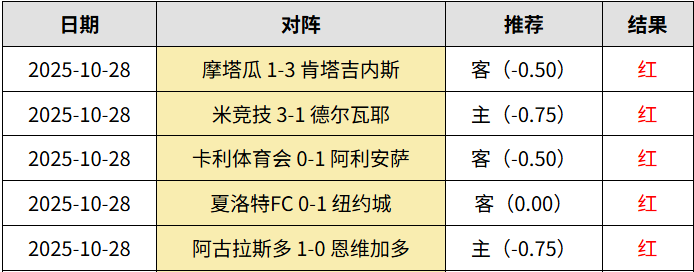 单日会员5中5!哥伦甲2场全红,阿古拉斯多拉达斯1:0轻取恩维加多,让步收米;卡利体育会0:1阿利安萨,受让稳稳收米!美职夏洛特FC0:1输纽约城。南美俱乐部杯米内罗竞技3:1淘汰山谷独立,命中比分!中美洲俱乐部杯摩塔瓜1:3肯塔吉内斯,被双杀出局!