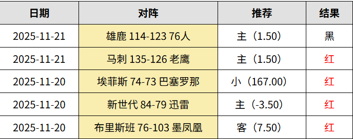 会员5中4!NBL凤凰拿捏子弹,小分一炮双响!韩篮甲原州新世代逆转首尔三星,大分双收!欧冠篮球艾菲斯1分险胜巴萨,受让+小分稳稳拿下。NBA2中1,马刺轻取老鹰,受让收米;雄鹿加时被76人逆转,错失单日全红。
