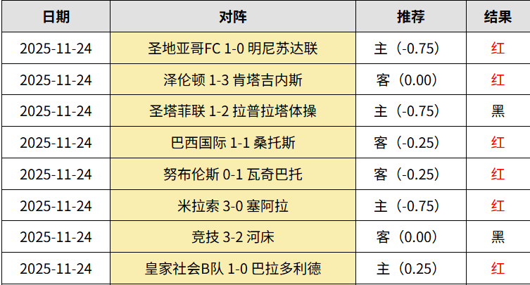 单日会员8中6!西乙皇家社会B队1:0爆冷巴拉多利德,抓到冷门。阿甲两场看反,竞技补时绝杀3:2逆转河床,平手不稳;圣塔菲联1:2爆冷不敌拉普拉塔体操。巴西甲2场全红,近6中5,米拉索3:0完胜塞阿拉;巴西国际1:1桑托斯,受让很稳。智利甲努布伦斯0:1输瓦奇巴托,继续收米。哥斯甲泽伦顿1:3肯塔吉内斯,差点命中比分。美职圣地亚哥1:0淘汰明尼苏达联,让步收米!