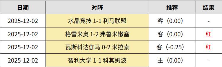 单日会员4中2走2!智利甲智利大学1:1科金博,让步走水。巴西甲2场全红,近19中15,达伽马0:2米拉索,受让足够稳;格雷米奥1:2弗鲁米嫩塞,差点命中比分!秘鲁甲水晶竞技1:1利马联盟,受让走水。