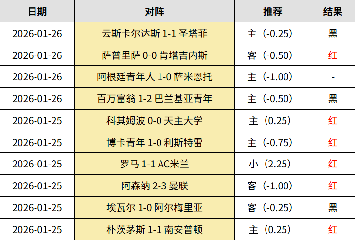 昨天会员10中6走1!英冠朴茨茅斯1:1逼平南安普顿,受让很稳。西乙埃瓦尔补时1:0阿尔梅里亚,受让被绝杀。英超阿森纳2:3输曼联,继续命中曼联爆冷!意甲罗马1:1AC米兰,主推小球最稳,命中比分!阿甲2中1走1,近11中7走2,博卡1:0轻取利斯特雷,再中比分;阿根廷青年人 绝杀萨米恩托走水。智利超级杯决赛。科金博0:0智利天主大学,点球大战夺冠,受让足够稳。哥伦甲两场看反,百万富翁1:2巴兰基亚青年;云斯卡尔达斯1:1绝平圣塔菲。让步输一半。哥斯甲萨普里萨0:0肯塔吉内斯斯,受让稳稳收米。