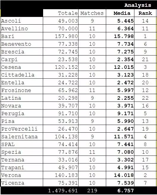 本赛季至今,意乙22支球队中场均上座人数过万的只有4支球队,分别是巴里(15798人/场)、维罗纳(14018人/场)、切塞纳(12015人/场)和萨勒尼塔纳(11571人/场)。场均上座人数在5000人以下的球队多达8支,最低的拉蒂那场均只有2255人。