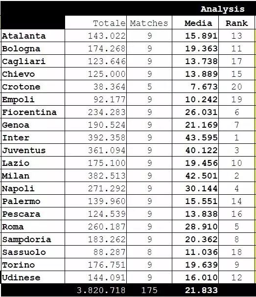 接下来的数据既供大家在投注是参考,也让“娱乐”一下。先说像样的,如今的丙级中唯一场均上座人数过万的仅有一队,莱切,场均11946人,其次就是刚从破产后刚从丁级升上来的帕尔马,场均9904人。场均人数低于1000的有18支球队。其中最低的是来自A组的卢帕罗马,场均上座185人,该队本赛季主场打奥尔比亚的一战是上座最低记录,100人!