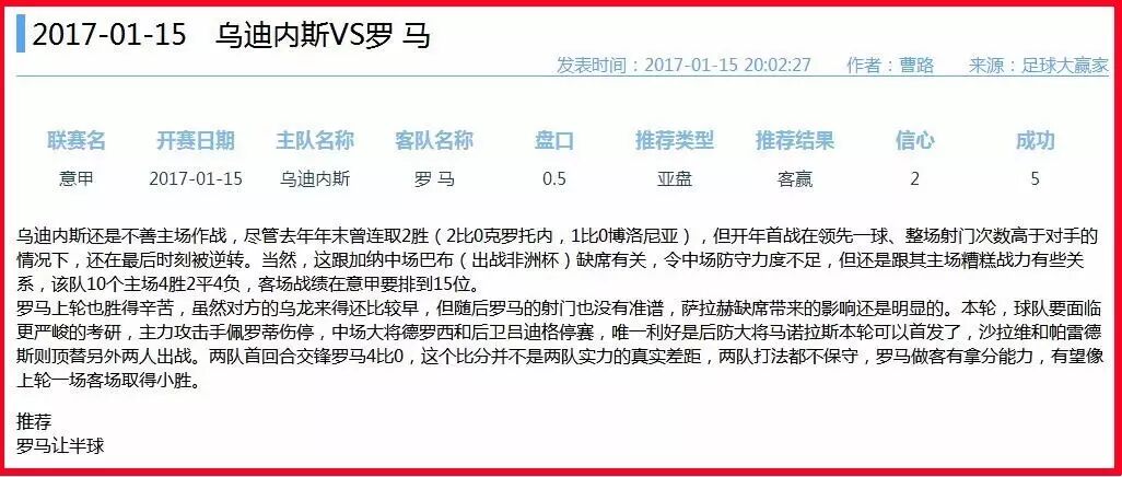 另一场经典分析来自罗马客场乌迪内斯,最终罗马1比0的结果,也在我的准确把握中,“两队首回合交锋罗马4比0,这个比分并不是两队实力的真实差距,两队打法都不保守,罗马做客有拿分能力,有望像上轮一场客场取得小胜。”那么罗马上一轮的比分是多少?客场1比0热那亚。