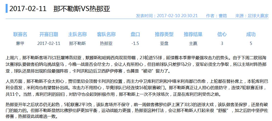 此外,昨天对那不勒斯的超强攻击力做了提点,是那不勒斯获胜的基础。另外也“精准”预计到了那不勒斯防守改进,8轮来首次零封对手。
