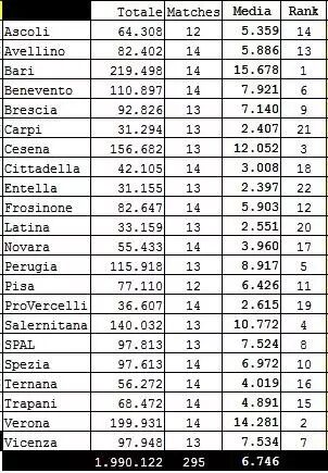 意乙本赛季上座情况(四个数字分别为,总上座人数,场次,平局上座人数和排名)