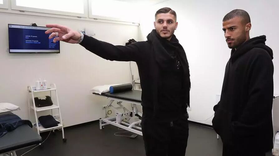 ▲国米队长伊卡尔迪向新援拉菲尼亚介绍队内情况。