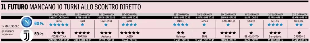 那不勒斯和尤文,意甲两强持续强势,你追我赶,争冠形势明朗化,仅此二队。里皮10多天前还说国米有望重返第一军团,本周接受那不勒斯《晨报》采访改口道:“意甲就两队争冠,国米和罗马城两队没希望了。那不勒斯和尤文旗鼓相当,要在最后冲刺环节才能见分晓。”