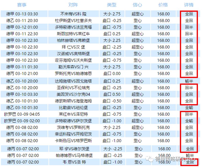 德甲策略研究中心正踏在最好的节奏之上,从上周五到本周一的14场德系推荐中,本栏目保持100%全赢的逆天势头。而从3月7日凌晨的德系比赛开始,总共23场临场推荐,仅输3场,获胜20场,胜率高达87%,而且战线覆盖德甲、德乙、德丙和欧战。