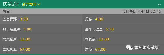 巴萨已低过了曼城成为3.5的最低赔率,按现在的状态巴萨曼城分列第一第二属于正常,拜仁5.0
