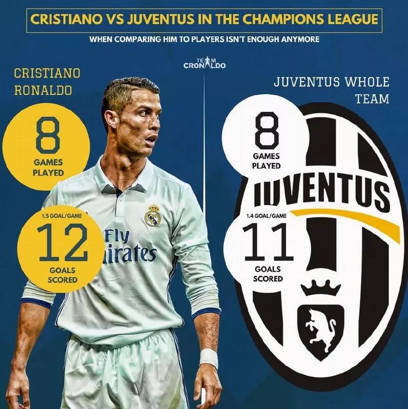 ▲本季8场欧冠,C罗一人打入12球,而尤文全队才打入11球。