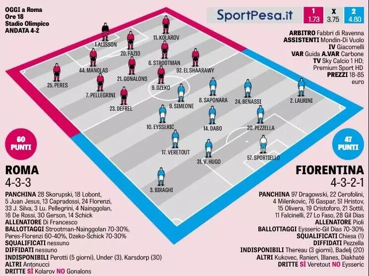 纳因戈兰在诺坎普临阵伤退,现已伤愈,但本轮可能会先坐替补席。阿根廷边锋佩罗蒂受伤,云代尔还在养伤,久疏战阵的德弗雷尔可能首发。这个追随主帅迪弗朗西斯科从萨索洛而来的中锋,本季在罗马打边锋一直表现不佳,本场恐也难有太大作为。