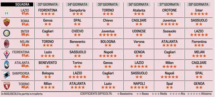 对比一下两个赛季32轮的积分榜便知。上赛季,前三名(欧冠资格)早早锁定,第3名那不勒斯领先第4名拉齐奥9分;本赛季前两名超级步伐,但身后形势复杂,多了一个欧冠且直接进小组赛的名额后,拉齐奥、罗马和国米三队仅1个分差,3抢2,异常激烈。