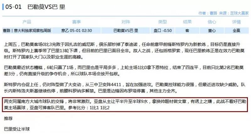在昨天实战版的推荐中,两场意系赛事全中,其中就包括这场意乙焦点战,亚盘红单之外,还推中波胆。主队从让平半升至半球,且水位一直在降。我在分析中也特别提到这一战的换帅题材被拿来做文章,有诱上之嫌,一举锁定了下盘的推荐方向。