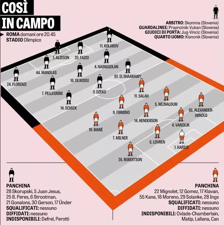 罗马的核心败因,应该是球队阵型太长,平均长度41.3米,而利物浦只有32.8米。而罗马的三后卫责任不明,萨拉赫扯边和菲尔米诺中路做球无人负责看守,不该踢得这么压上暴露后场空间,重心靠后一点打反击或许更好。有此经历,想来罗马主场会用433的习惯阵型。