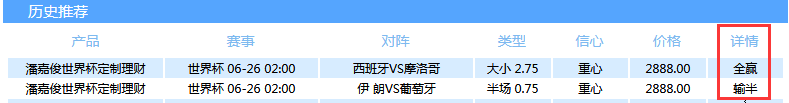 随后两场,潘嘉俊定制理财栏目的情况类似,战绩统计上只是1中1错,但实际是有盈余的。伊朗VS葡萄牙的半场小球,只是输半盘,而全场推荐伊朗顺利开出,并且下盘是接近2.10的高水水位。