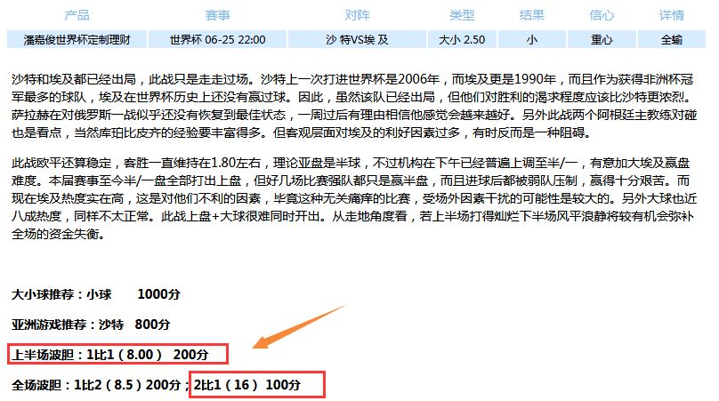 至于西班牙VS摩洛哥,错信上盘,但个人更重心的投注量在大球,因此也有盈利,数量大概在1900分左右。A组两场合计亏损1400,因此合计4场尚有500分左右的盈利。当然,订户在实际投注时可能会有一些水位差异,但如果是照单全跟的话,至少是不会出现亏损的。此外,俄罗斯VS乌拉圭一战,开场不久的落后和红牌,让俄罗斯失去了抵抗之力。彩民在临场是可以通过滚动挽回损失的,不过嘉俊并未开通滚动栏目,而且因从录入到用户收到信息的时间差关系,个人觉得滚动推荐实操性不算很高。通过滚动去弥补损失,只能由用户自行判断。