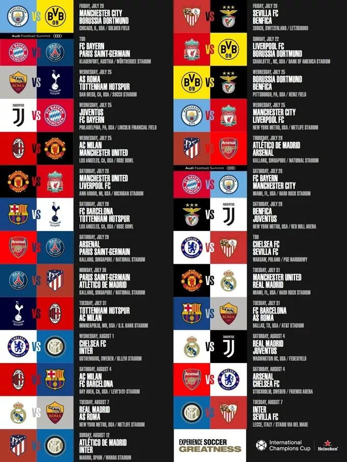 今年的国际冠军杯,主赛场在美国,其次亚洲的新加坡,而欧洲地区将覆盖部分新增城市比如伦敦和法鲁(葡萄牙),而传统城市法国尼斯和奥地利克拉根福等都继续有赛事。划重点的是:今年没有中国赛区,但是2019年会恢复。