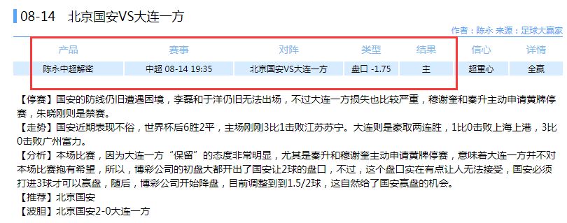 中超第18轮有两个比赛日,首个比赛日只有北京国安VS大连一方,在让1.75的情况下,记者果断推荐北京国安,这源于大连一方在上一轮内外援都主动申请黄牌停赛,结果自然没有任何疑问,再次命中。