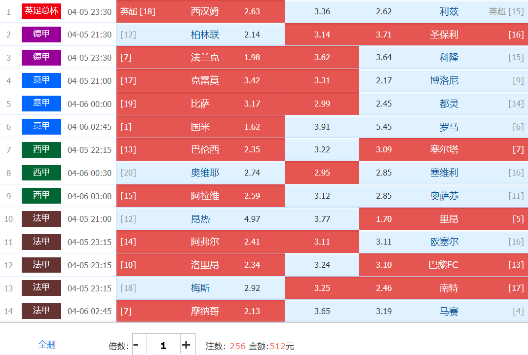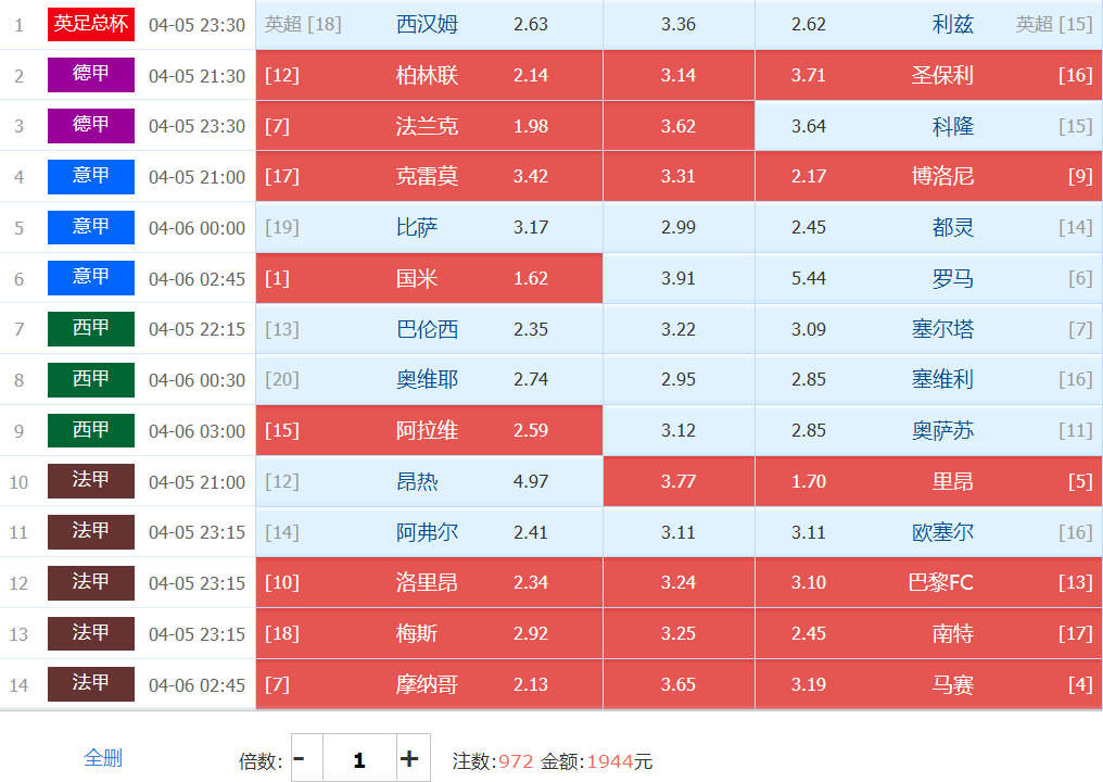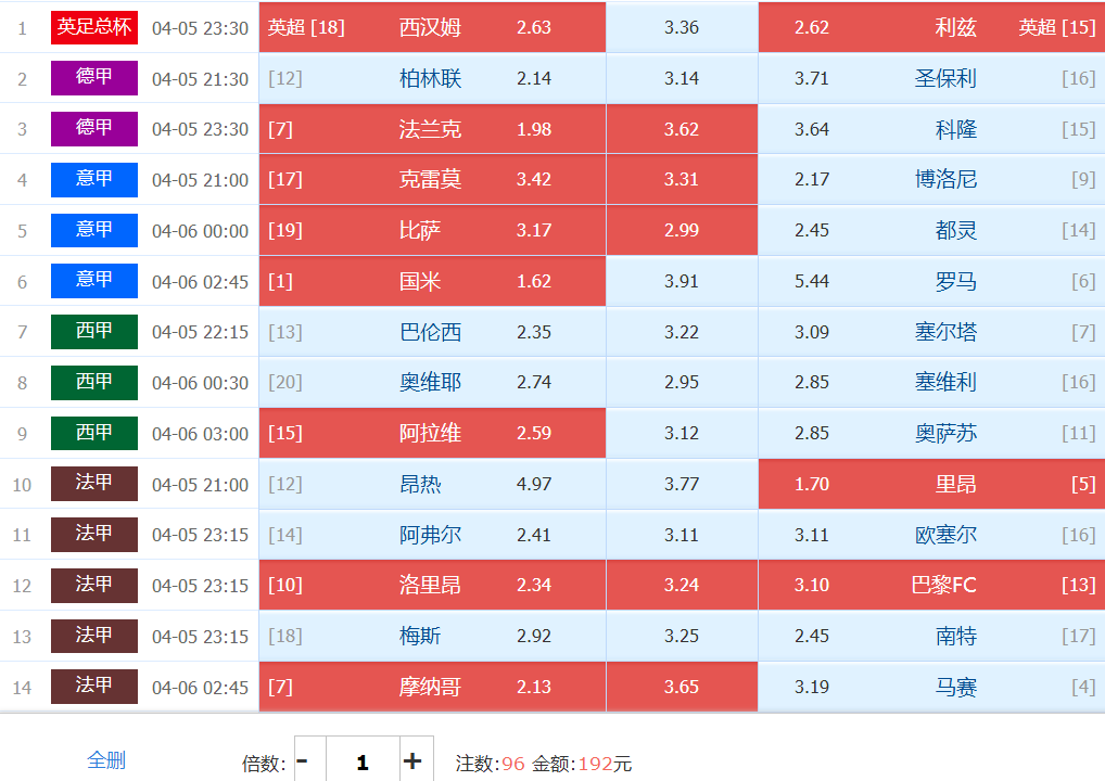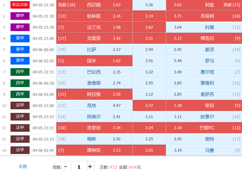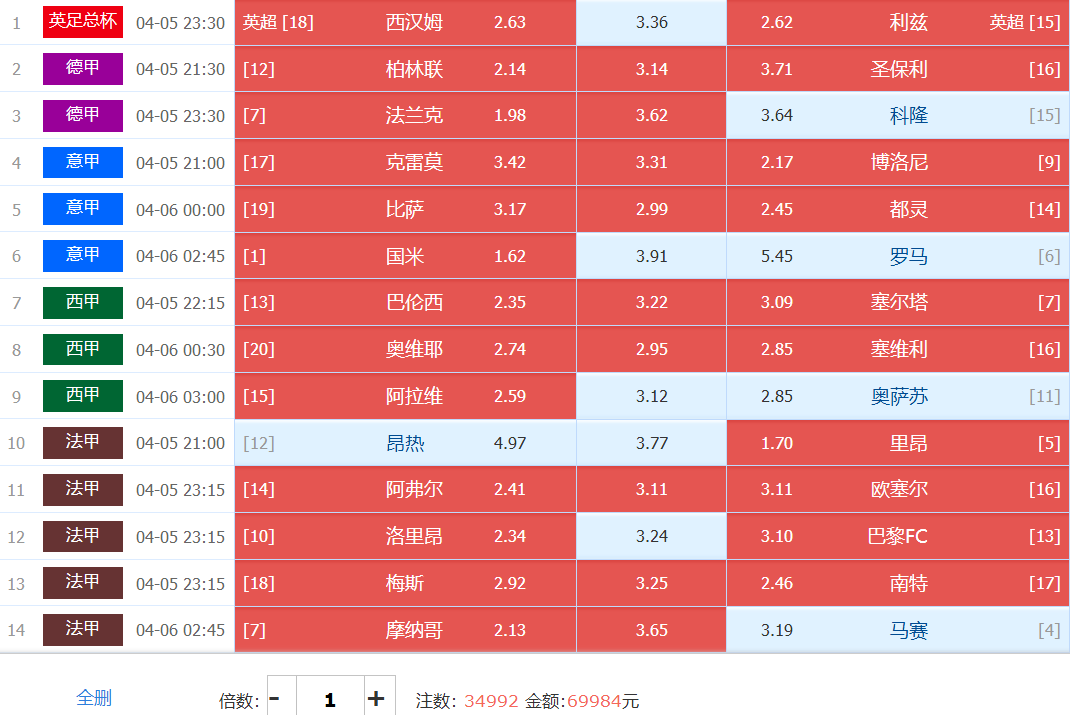 胜负彩实战单:基于大底单做减法——搏胆摩纳哥,克雷莫纳和比萨全部走冷门31方向,柏林联合走10、勒阿弗尔走31、巴伦西亚走30